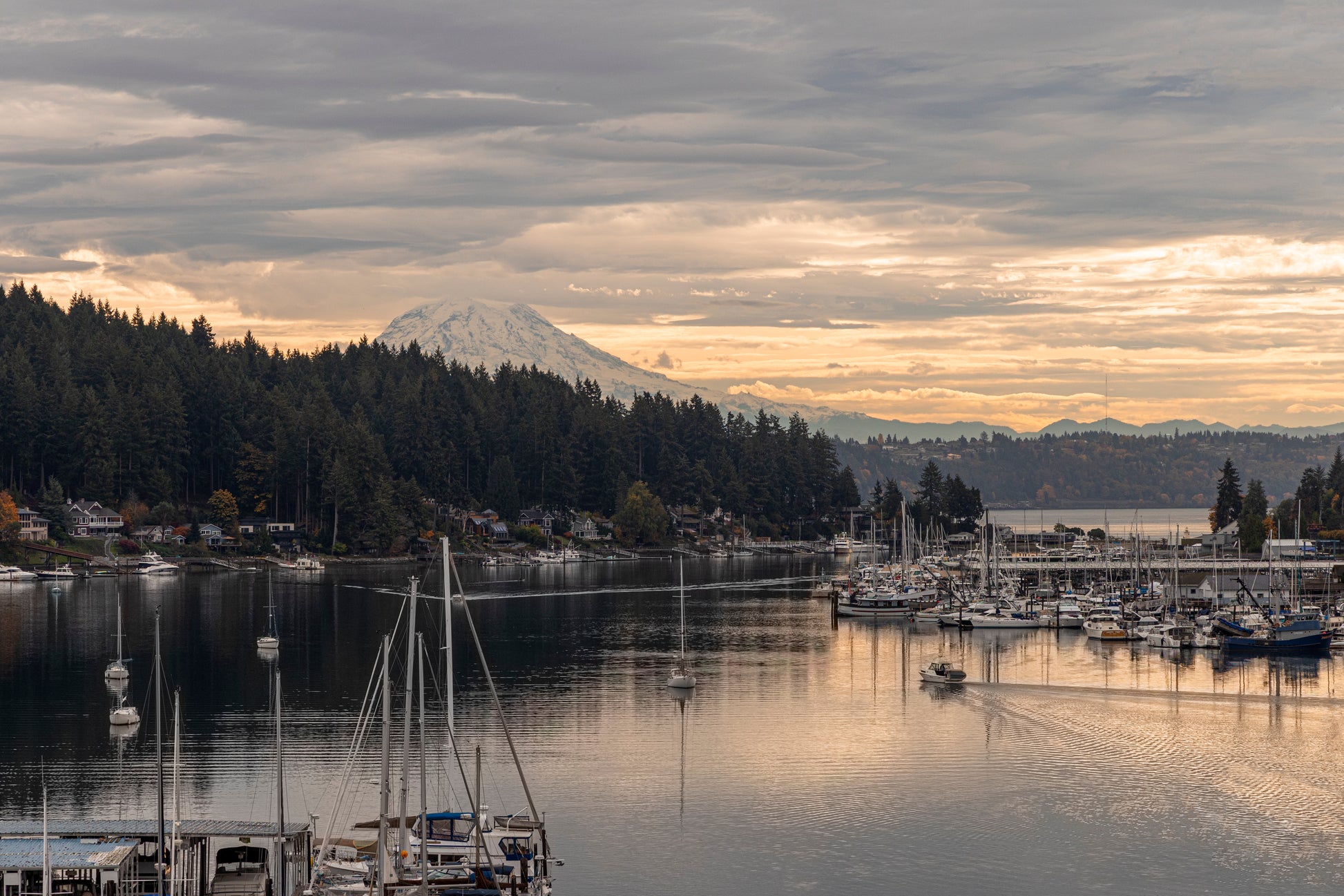 Golden light shimmers off of the calm waters in Gig Harbor with a view of Mt. Rainier peeking over the tree line. Printed on Hahnemühle luster paper.